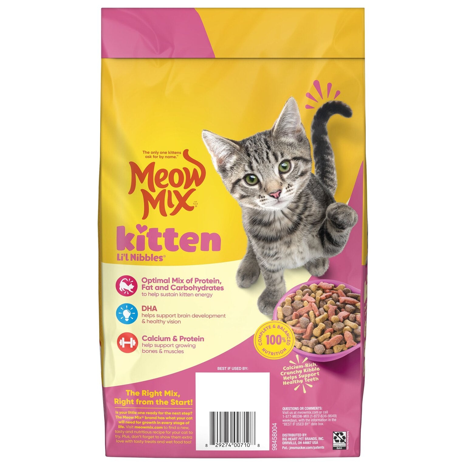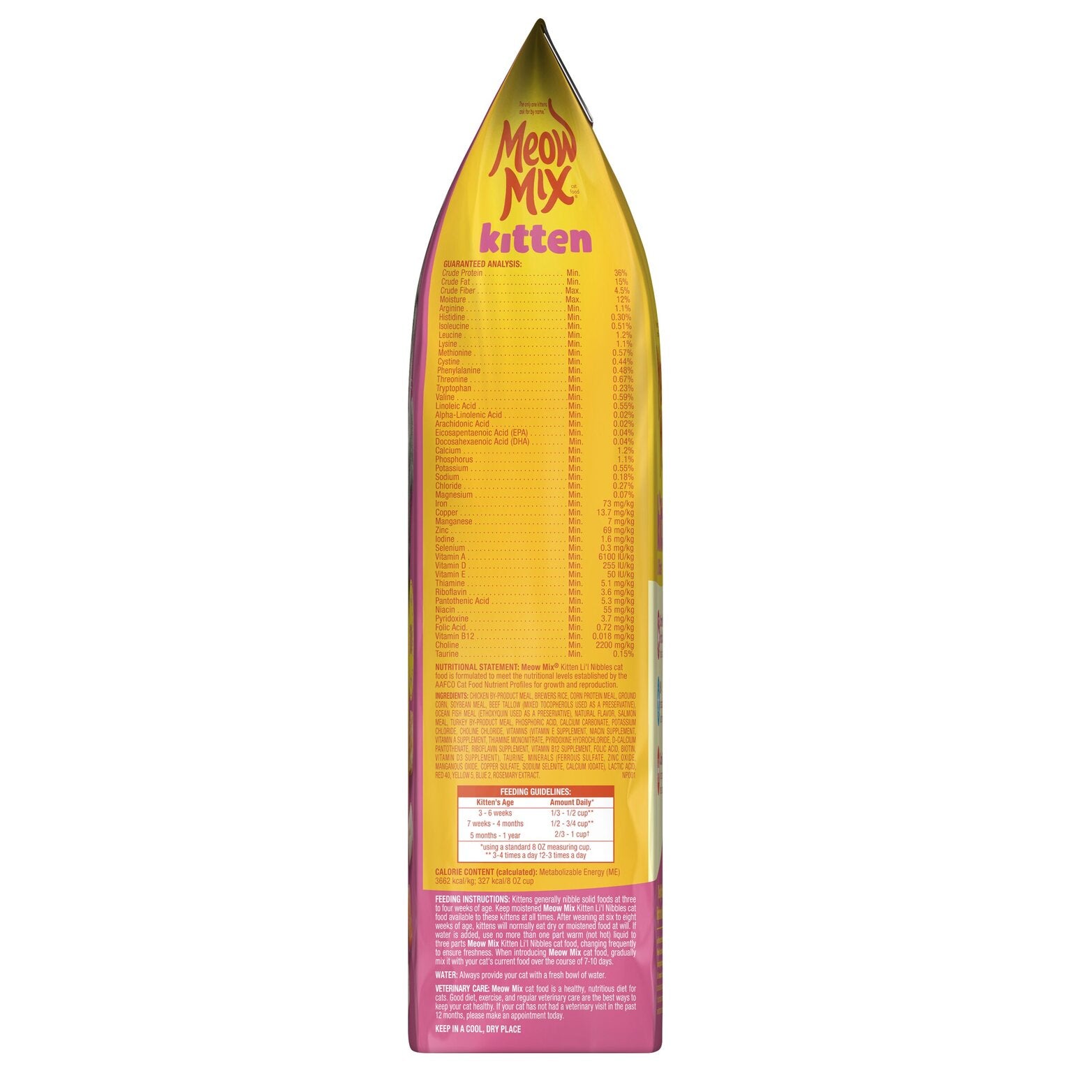 The tasty smaller kibbles in our Meow Mix® Kitten Li'l Nibbles® dry cat food contain all essential nutrients needed to help kittens grow up healthy and happy. High-quality protein and essential fatty acids help support muscle growth and healthy brain development. Irresistible flavors make this more than just a meal...it's Meow Mix Mealtime!